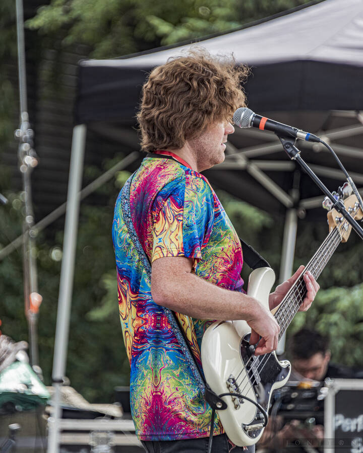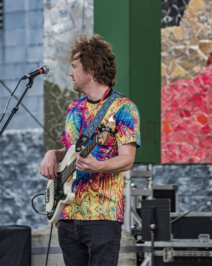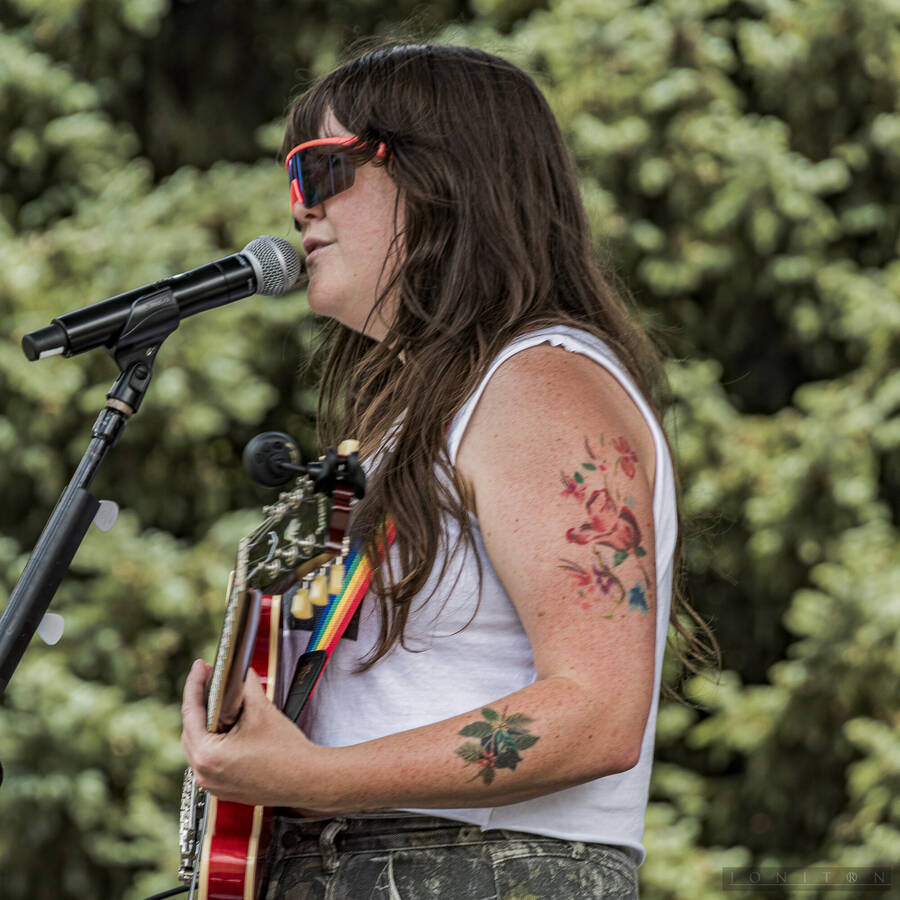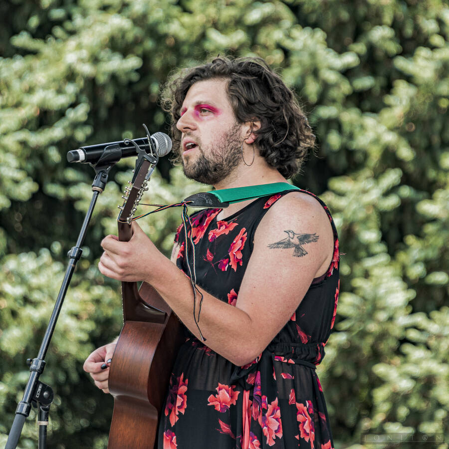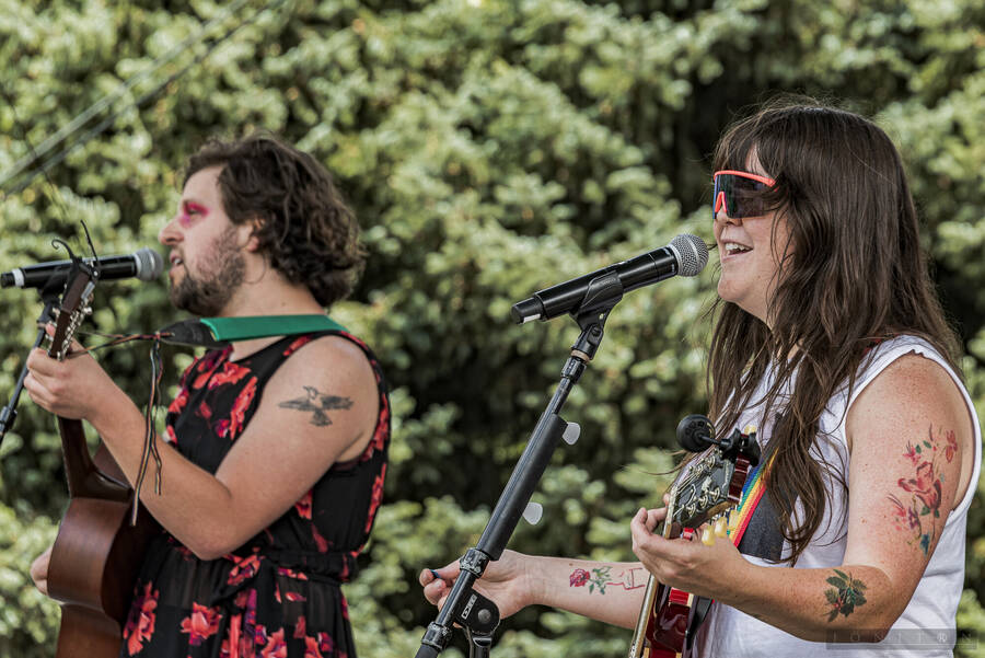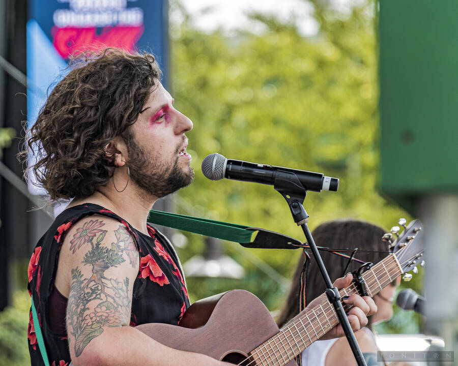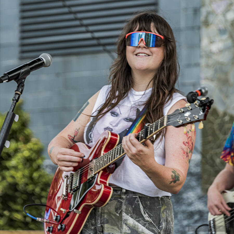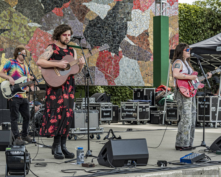 Images from multiple musical performers at Seattle Center's Horiuchi Mural Stage during the 2024 Seattle Pridefest.