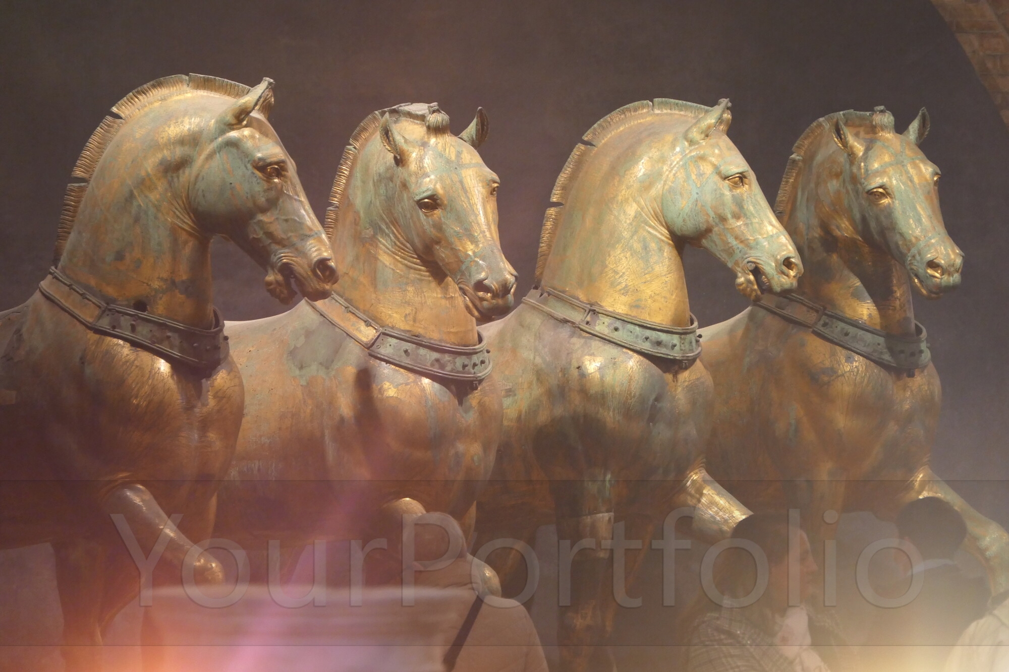 Technically, they are not made of bronze. Analysis has shown they are around 96.7% copper, so they should be regarded as being cast from impure copper rather than bronze. The low tin content in the alloy creates the unusual mercury gilding of the statues. The collars round the necks were an addition once they arrived in Venice, designed to disguise where the necks had been sliced through for transportation.