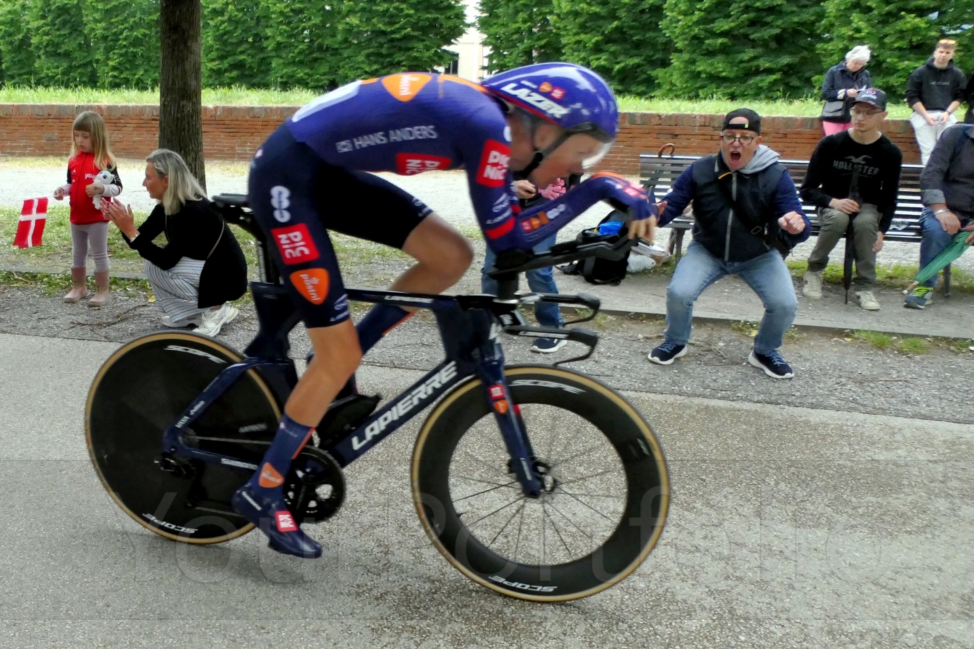 Gijs Leemreize of Team Picnic PostNL, during the Individual Time Trial stage of the 2025 Giro d'Italia. With enthusiastic fan.