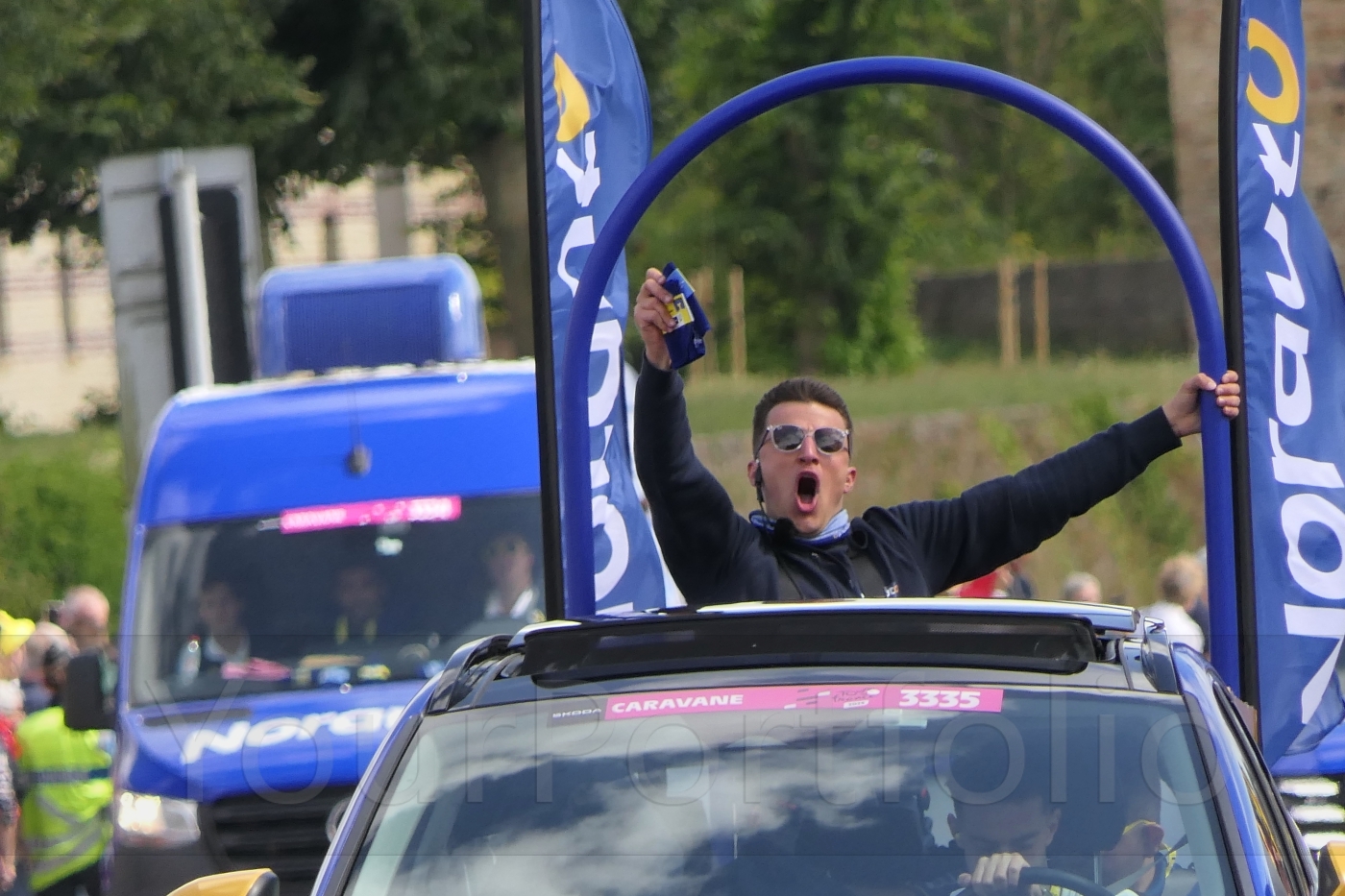 La Caravane Publicitaire has been a fixture of the Tour de France since 1930. Preceding the race on the road by about 60-90 minutes, it is a bizarre convoy of sometimes extraordinary vehicles, decked out in the colours of the race's sponsors and staffed by a legion of young men and women employed to dispense shedloads of cheap plastic tat to the waiting fans, by the simple expedient of chucking it at them. This was stage 3. I hope he still had that energy on stage 21.