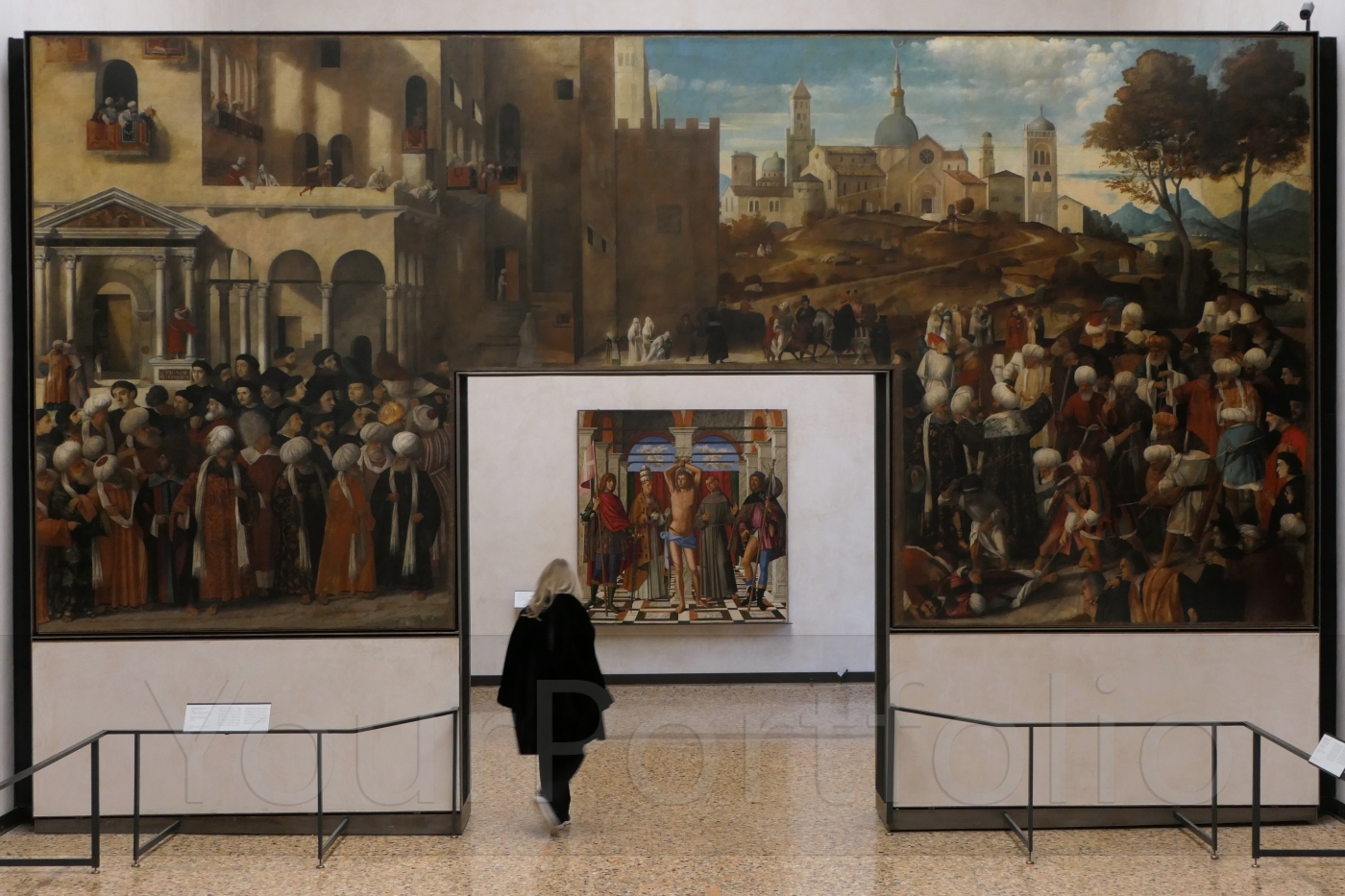 The larger painting is 'Martirio di San Marco' ('The Martyrdom of St. Mark', patron saint of Venice) by Giovanni Bellini & Vittore Belliniano (1515-1526). Bellini was commissioned to paint the work in 1515, but died the following year, after which Belliniano was hired to finish it. It depicts the martyrdom of Saint Mark, who was dragged through the streets of Alexandria until dead. Curiously, the actual martyrdom is confined to the lower right portion of the panel, leaving the rest of the painting for the crowd scene and the backdrop.